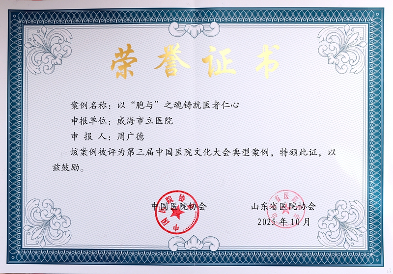 2025年10月25日,由中国医院协会与山东省医院协会联合主办的第三届中国医院文化大会在儒家文化发源地山东曲阜举行,大会以“坚定文化自信,传承医学人文精神,提升医院内涵质量”为主题,旨在推动医院文化建设与高质量发展。在此次大会上,山东大学附属威海市立医院申报的医院文化建设案例被评为“第三届中国医院文化大会典型案例”,同时在健康科普领域斩获多项殊荣,成为大会上展现医院文化建设与健康科普成果的标杆单位之一。 文化铸魂:“胞与”之仁心彰显医者担当 在医院文化建设领域,威海市立医院申报的“以‘胞与’之魂铸就医者仁心”案例,经中国医院协会与山东省医院协会专家评审,成功入选第三届中国医院文化大会典型案例。该案例以“胞与为怀,至爱人生”的医院精神为内核,深度融合医学人文与儒家“仁爱”思想,展现了医院在传承医者仁心、塑造行业清风方面的创新实践。山东省医院协会相关负责人表示,该案例在挖掘传统文化与现代医学人文的结合点上极具代表性,为全国医院文化建设提供了可借鉴的“威海样本”。