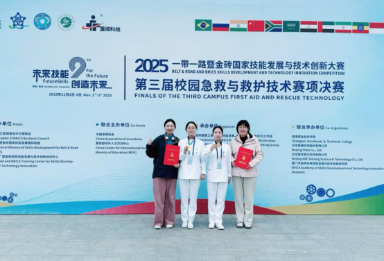 2025年11月2日至5日,第三届“一带一路”暨金砖国家技能发展与技术创新大赛——校园急救与救护技术赛项决赛在陕西商洛职业技术学院举行。全国228名选手同台竞技,威海市卫生学校学生曲佳音、冷依凡在医卫组150名选手中脱颖而出,荣获一等奖;指导教师王蓉、张咪咪获评“优秀指导教师”,学校获“最佳组织奖”。 通过参赛,进一步提升了全校急救能力和应急知识储备,为构建安全校园、健全应急体系奠定了坚实基础。市卫生学校将以此为契机,继续秉持“赛证融通、融合共享”的理念,着力培养技精业勤的师生队伍,为全面推动卫生健康事业高质量发展,贡献更大力量!