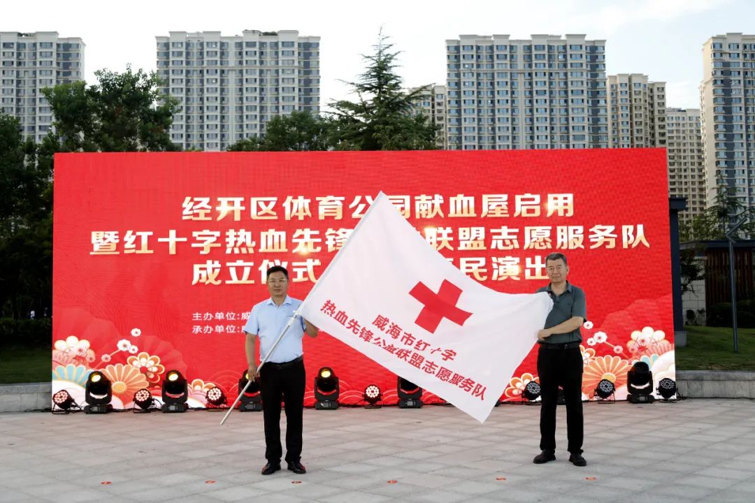 威海市红十字会副会长丁永东向新成立的“威海市红十字热血先锋公益联盟志愿服务队”授旗。 市人大教科文卫委委员、威海爱尔眼科医院负责人、志愿服务队队长戚中一接旗并发言。他表示,服务队将积极践行“奉献、友爱、互助、进步”的志愿精神,引导更多的社会资源支持和捐助无偿献血公益事业。 仪式结束后,精彩的文化惠民演出拉开帷幕。歌曲、舞蹈、乐器演奏、川剧变脸等节目轮番上演,吸引众多市民驻足观看。 活动现场还设置了无偿献血爱心打卡点,志愿者向市民发放科普宣传单和夏日解暑小扇子,传递献血知识。当晚共有5位爱心市民参加献血。 | ||||